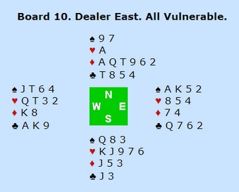 Spillet var et potensielt pluss spill for Norge da Morath i Øst åpnet med en 10-13 grand. Den passet Bjerregård og ti stikk ble resultatet. Da heller ikke Tor og Arve meldte utgangen, gikk spillet ut.