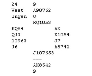 Jeg vurderte at kløver konge måtte være et viktig kort og satset på at makker kunne stoppe et eventuelt ruterutspill. Utspillet svingte 8 stikk. Med ruter ess ut ville 3 stikk være resultatet og 600 til motparten. Heldigvis valgte Bjerregård hjerter ut og dermed var jeg rask til å innkassere de 11 stikkene.