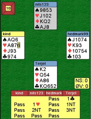 Begge bord kom i tre grand og utspillet var liten hjerter. Helge stakk med damen, fortsatt med kongen som jeg stakk over. Fem hjerterstikk gav en bet.