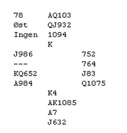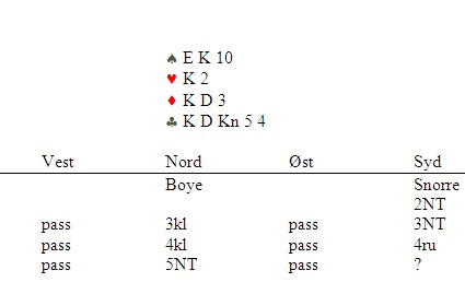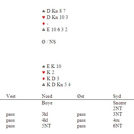 Ved vårt bord gikk meldingsforløpet p-p-2klø*-? Vi har veldig godt sys i posisjonen hvor makker svarer 2ru på OD med 0-7, der med tenkte jeg at på alle andre svar var jeg i utgang. Valgte derfor å doble i stedet for den mer normale 2NT på mine 16 gode HP, Så når det da gikk x-p-2ru-p, måtte jeg melde 2hj, som kun viser 4kort hj og en normal OD, makker kunne/burde(?) Kanskje meldt 3ru første gangen nå ville 3ru bare vise lengde og forsøk på å bedre kontrakten. Vi kunne begge valgt å melde annerledes ved første anledning i sum ble forsiktigheten behørig straffet med 10 imp ut! Så som Tor og Geir sier NT er NT og det å gjøre Bridgen enkel er gode regler!