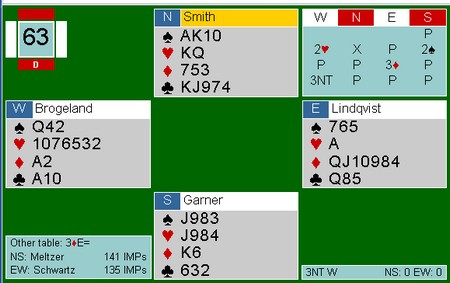 "Nei, Snurr. Det er ikke Lavintahl i denne posisjonen". Jeg bøyer hodet i skam, men spør ærbødigst hvordan vi skulle klart dette hvis vest hadde hatt f.eks kløver knekt og spillefører K10, slik at jeg MÅTTE tidlig inn? Dette også gitt at spillefører han dobbel ruter.