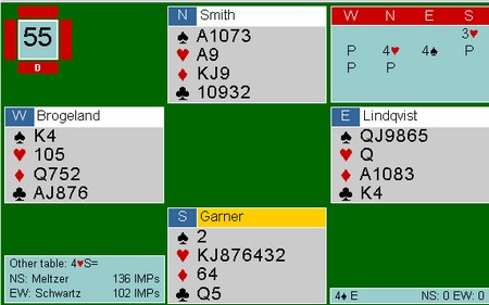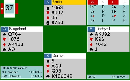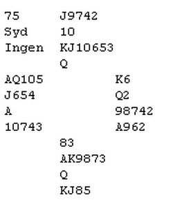Som sagt så gjort,. men pasienten døde. Kløver 9 tolka Boye som at jeg hadde 98 i kløver og spilte fargen rundt til åtteren til spillefører. Påtrøkk de luxe og en elendig score for -110.