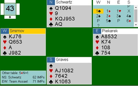 Syd åpnet med 1hj, Boye i vest meldte inn 1sp (?), 1NT fra nord, 2hj i syd og pass rundt. Kløver fire ut til esset mitt i øst.