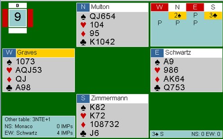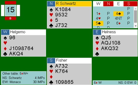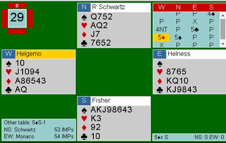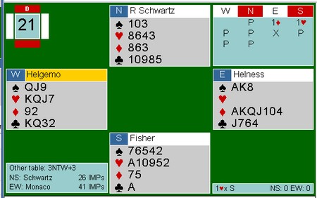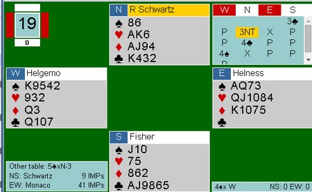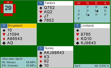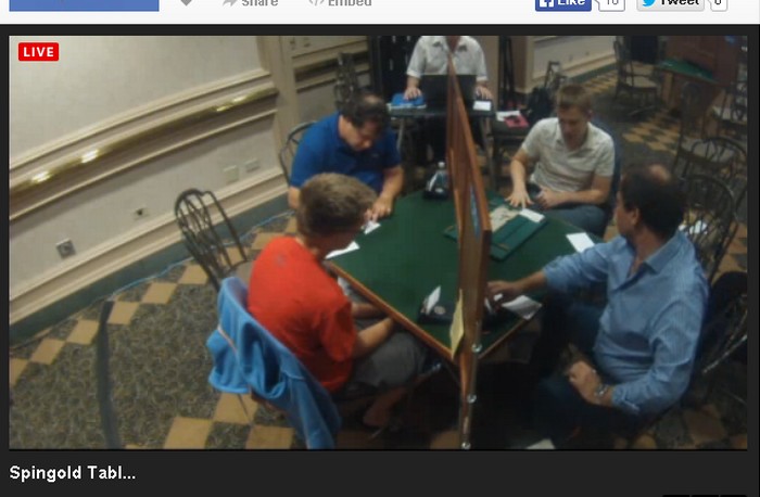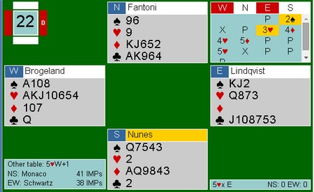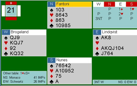 Kløver ut til esset ble fulgt av 2 runder hjerter, den siste til hånden. Nå kom ruterkutten i vinden fulgt av ruter ess og ruter til røff. Så var det sparen som skulle gjettes og når Marcus valgte spar til knekten var det hele over. På andre bordet sperret Christian Bakke med 3 kløver i nord hvorpå øst/vest landet i 4 hjerter.