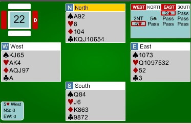 Meldingsforløpet på bildet tilhører Norge U25 mot USA der Kristian Ellingsen spilte 5 hjerter. Den gikk 1 bet. Utspillet var det samme og fortsettelsen likeså helt til tredje runde ruter som Kristian ga bort til kongen i sør og føk opp på spar konge etterpå.