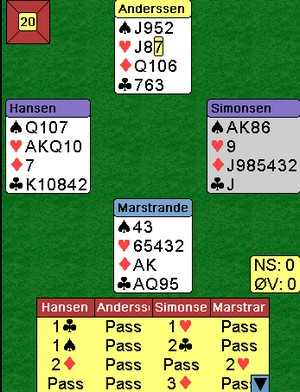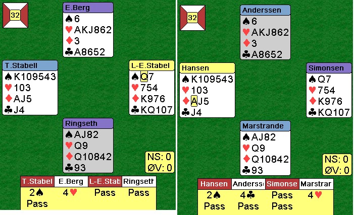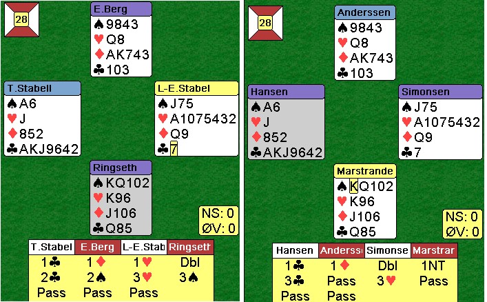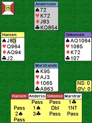 "Vi har det også bra. Nå venter vi på par, men er ikke helt sikker på reglene. Det er sikkert oversiktlig nok, men vi har bare ikke satt oss helt inn i det. Det viktigste er å ta mange stikk i gode kontrakter. Da går det helt sikkert bra. Flott også at NM Veteran gikk over tre fulle sesjoner. Vi likte ikke helt at NM Veteran og Åpent NM lag gikk samtidig, men vi skjønner at noe må kollidere.