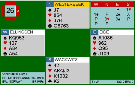 Tolle Stabell spilte ut spar 9, svenske utspill. Dette er typisk fra knekten tredje. Den gikk via damen til esset. Så ruter til tier og konge. Leif Erik Stabell skifta til hjerter 2, svenske som viser fire stykker, som gikk rundt til syd sin knekt. Spillefører var markert med kongen tredje i hjerter, så Tolle fridde seg i ruter som bordet vant med damen. Nå gikk faktisk toget for NS.