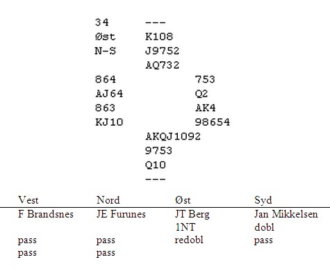 Jeg har fått beskjed av Jan Tore Berg om bare å skrive om gode spill av han, men når de driver med barnestreker som dette, så har han bare seg selv å takke. Det er mange som sverger på Mini-NT og det funker sikkert bra i mange spill. I alle fall mot svakere motstand. Her dobla Jan Mikkelsen opplysende med syv gående spar og ikke lenge etterpå skulle han spille ut mot 1NT redobla. Tre beit og 1000 inn.