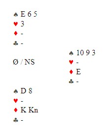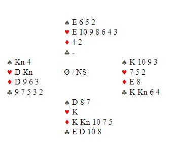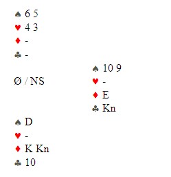 Så hjerter konge, kløver til stjeling, ut med trumfen og en liten spar mot bordet. Øst stakk og nå lå kløver ti singel igjen i bordet. Det ble fristende for øst å ta for kløver knekt og fjerne bordets kløver 10. Det skulle han ikke gjort, for med fire kort igjen er dette stillingen: