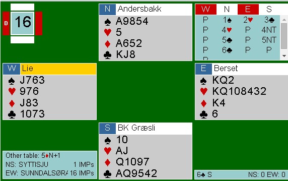 2sp fra øst viste hjerter og kløver, mens resten var naturlig. Hvis 4hj fra Ivrig i nord kan kalles naturlig da. Han mente å vise litt spar og ruterfarge. Hva jeg mener om vest sin dobling, får du ikke høre. Annet enn at opplysende doblinger på 4-trinnet sjelden er lurt. Det blir en anelse lettere å være spillefører når motparten er så snill å fortelle deg hvordan det sitter. Et typisk eksempel på at i jakten på 200 i stedet for 100 ble prisen -790 i stedet.