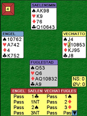 Silla hadde ingen problemer med å ta sine ni stikk etter hjerter ut til kongen. Ruter til tieren, spar til esset, ruter til damen, ruter ess, spar dame og spar til nieren. Sparvalget var rimelig opplagt med tanke på at ruteren satt 6-1, pluss "the rule of restricted choise". Likevel en utgangssving til Gillis