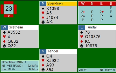 Jeg så flere vellykka Multi-åpninger i dag, men denne av Grøtheim - Tundal kosta 1100. Sikkert en "opplagt" dobling av Petter, men jeg synes nå det er fint å se på likevel. Mange ville meldt 2sp på øst sin hånd (pass med spar og meld 3hj/4hj hvis du ikke har). Da blir det verre å få tatt ØV, men det er mulig 2ru - 2sp betyr noe annet for ØV.