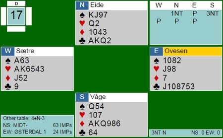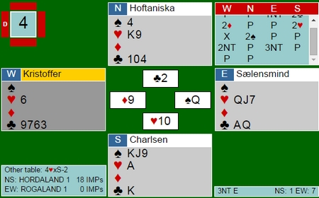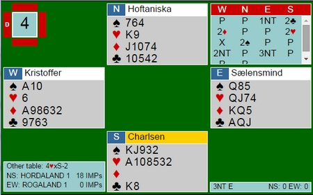 Thomas Charlsen spilte ut en spar til tieren som stod. Nå så det ut som det var minst ni enkle stikk, men 4-0 i ruter var ikke greit. Uansett måtte Silla godspille ruteren og inne på den fjerde fortsatte Hoffa med spar til singel ess i bordet.