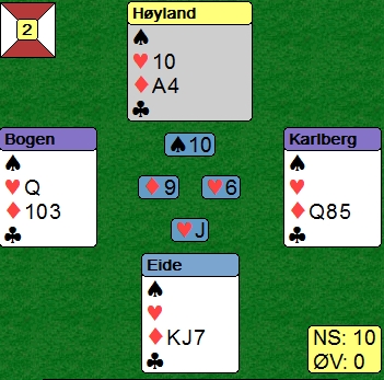 Hjerterkongen ut til esset. Så en gang spar, tre ganger kløver til stjeling og all trumfen. Med tre kort igjen er stillingen som under. Legg merke til at Håkon Bogen kasta ruter ni og beholdt treeren. Under ruter ess la han tieren og da har jeg stor forståelse for at Magne Eide spilte på at vest var skviset. 100 inn til Vest-Agder og 17 IMP i stedet for 2210 ut og 13 til Vestlandet. Det er små marginer som gir store utslag i bridge.