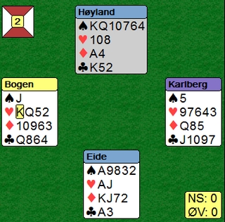 avhengig av ruterdamen. Vest-Adger hadde stoppet i 6sp, er kontrakt som lett ble vunnet. Hordaland Sven Olai Høyland og Magne Eide meldte seg helt opp til 7sp. Ser du alle kortene vinner du lett alle tretten stikkene ved enten å stjele ut ruterdamen eller ta kappen. Magne Eide fant en spillplan som var en tredje variant.
