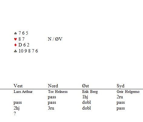 "Kunne vi klart å meldt denne slemmen?", spurte Lars Arthur. Jeg vet ikke, men skulle det være sjanse så må Erik tolke passen på 6hj som singelton og EK i ruter?