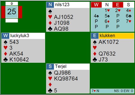 4ru og 5sp viser begge renons. Når Terje så cuebider 6kl, tror selvsagt Nils av det er kongen og hånda hans vokser enda mer. 6ru er "last train" og betyr at han har ikke gitt opp 7hj enda, men kan ikke melde det selv. Syv trumf mente Terje Lie var nok og det stemte. 12 trumfstikk på kryss pluss kløveresset.
