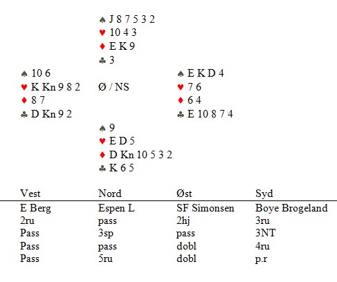 At Nils gikk 1100 i 2rux er litt tilfeldig og uheldig. Det er nok i ingen vits å melde seg på i slike spill, i alle fall med en passet makker, men vi har gjort det alle sammen ustraffet. En vinner ikke i bridge ved å tro at en skal passe seg til seier, men dette var i alle fall ikke gangen å doble 1hj.