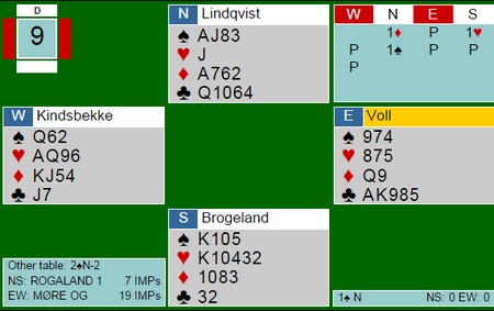 I første halvrunde vant Hauge syv spill med små IMP'er, blant annet tre femmere. De er også viktige, spesielt i innbyrdes oppgjør. I lagkamp må en være mye forsiktigere enn i par, men det går ikke an å være for passiv heller. Boye var flink og passet ut 1sp og vant akkurat syv stikk. På den andre bordet kom NS i 2sp med en beit. 5 IMP. Jeg vet ikke om vest bør melde 1NT i utdøende over 1sp, selv i lagkamp. Denne gangen vinner ØV lett 1NT.