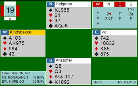 Spillet under er et spill der Boye Brogeland vurderer bedre enn Asbjørn Kindsbekken. Boye spiller ut hjerteress, mens Kindsbekken inviterer.
