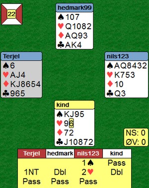 Tøff dobling av Asbjørn Kindsbekken Skrevet 15. mars, 2015 av 7988 Snorre Aalberg Jeg tror de aller fleste av oss hadde passet med syd sine kort, men Sunndalsøras store sønn så potensialet i sine kort når makker hadde vist en god åpning, sannynligvis med firekort hjerter. Trumf ut og Nils klarte bare fem stikk for -800. Tøft!! Legg til kommentar