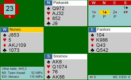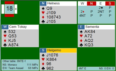 Sementa - Tokay passer ut invitten, mens Fantoni - Nunes kommer i 6NT etter en nesten identisk sekvens fram til 4NT. Selv med kløveren 3-3 og hjerterkongen foran damen var det bare 11 stikk. Eneste vinnersjanse i praksis hadde vært 3-4-3-3 / 3-5-2-3 / 3-6-1-3 i syd med hjerterkongen og DKn10 i spar. Da ville han blitt innspilt i spar og måtte gitt bord to i hjerter. (3+2+-3+4 = 12).