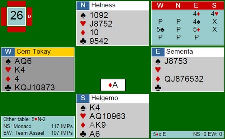"Alle" trodde vel at 40 IMP skulle holde på 15 spill for Tor-Geir og Fantoni-Nunes. Det gjorde det ikke og Team Assael (Piakarek-Smirnov, Sementa - Tokay) vant med hele 54. Det er et snitt på over 3,5 IMP pr. spill. HER ER HELE KAMPEN.
