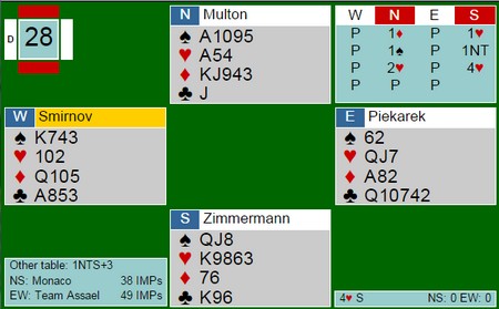 Så skjønner jeg ikke helt Geir Helgemo sin spilleføring i 4hj i spill 23 Åpent Rom, der han blokkerer trumfen, men det er helt sikkert et poeng jeg ikke evner å få med meg. (tror han planlegger å ta to runder trumf og så stjele den fjerde sparen med hjerterdamen hvis fire spar sitter sammen med tre hjerter. Til slutt kan han klare å få det tiende stikket med hjerter 3 på en kløverstjeling etterpå. Kan det være beste odds?) 10 stikk i lukket etter en flott spilleføring av Smirnov. For meg ser det ut som kontrakten står på å finne sparen, men russeren klarte det likevel med en tøff skivs i spar/kløver mot vest. (Spill 23 - lukket rom)