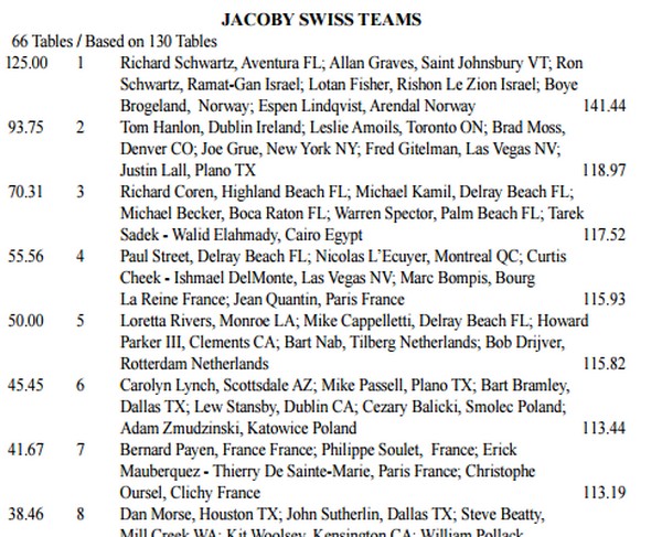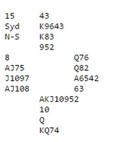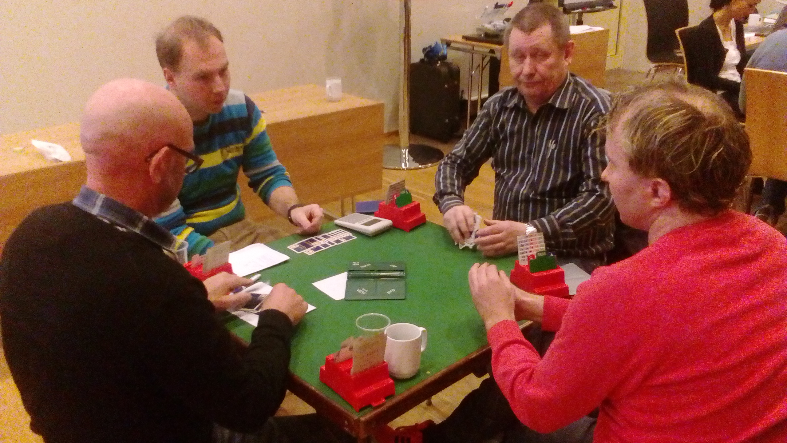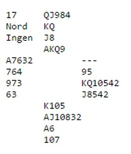 Ruter knekt ut til esset og kløver i skift. Damen ble stukket av esset og kløver knekt opp igjen til kongen din. Fem bord tok EK i spar og måtte få både spartaper og enda to kløvertapere. Du spiller selvsagt en tredje kløvere etter å ha vunnet med kongen. Sitter fargen 3-3, står tassen. Sitter den 4-2, stjeler du den siste i bordet og øst må stjele over med trumfstikket sitt.