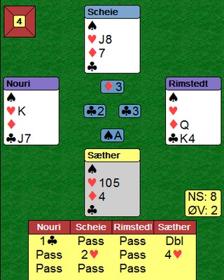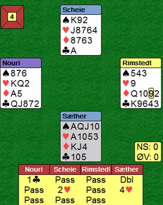 Scheie tok for kløveresset, stjal en kløver og spilte fire ganger spar. Vest skjønte hva som var i ferd med å skje, så han lot være å trumfe. I posisjonen under fikk han komme inn på hjerterkongen og det var ingen mulighet å få tak i ruterstikket lenger.