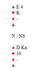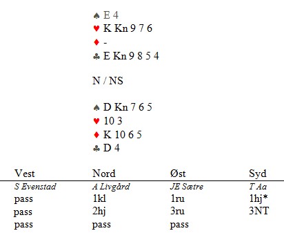 Dette stemte, og neste gang Jon skulle melde, var motparten (selvfølgelig) på 4-trinnet. Nå meldte han 4NT, men motparten meldte kjapt på 5-trinnet og to passer til Jon. Reint gjettverk nå. Hva som hadde skjedd over 4NT, er det ingen som vet. Det er heller ikke poenget i dette.