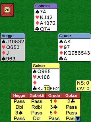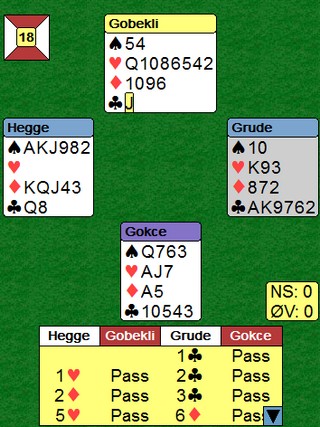 Exclusion Blackwood sier alle spillere at de kan, men i  MINST 50% av tilfellene går det galt. Jeg skjønner godt at Kristoffer Hegge ville spille slem når makker hadde åpning og mange kløver. 5hj spurte etter ess, men hjerteresset teller ikke. 6kl viser to aktuelle ess, men av en eller annen grunn svarte Tor Eivind Grude 6ru. (forbehold om at BBO har tasta rett)  Dette kunne vært innertier, men med singel kløver ut fikk nord en stjeling og beit. Heldigvis for Norge sto heller ikke 6kl. Tyrkia stoppa i 4sp og vant spillet.