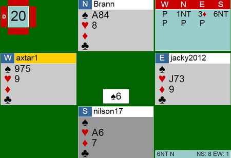 Siden øst han mange ruter, er det naturlig å spille på sparlengden i vest. Derfor spar til kongen og sitsen oppdages. Spar ti blir dekket og bordet vinner. Fire ganger kløver (litt heldig) og stillingen er denne etter å tatt ruteresset. (viktig)