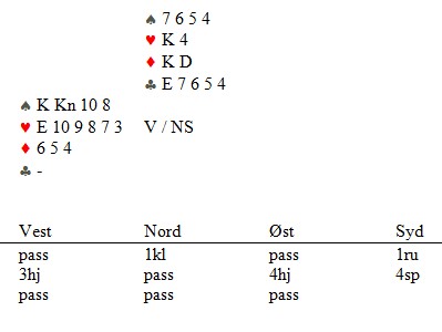 Vest starter med hjerter ess og mer hjerter. Øst har tre og syd to. Spar til damen og din konge. Du spiller spar knekt opp igjen og syd sukker tungt når øst legger styrke i kløver.