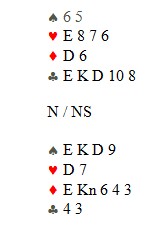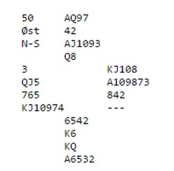 Du har meldt deg opp i 6NT og får hjerter ut. Du har ikke noen valg, men må legge liten i  bordet. Damen vinner heldigvis stikket.