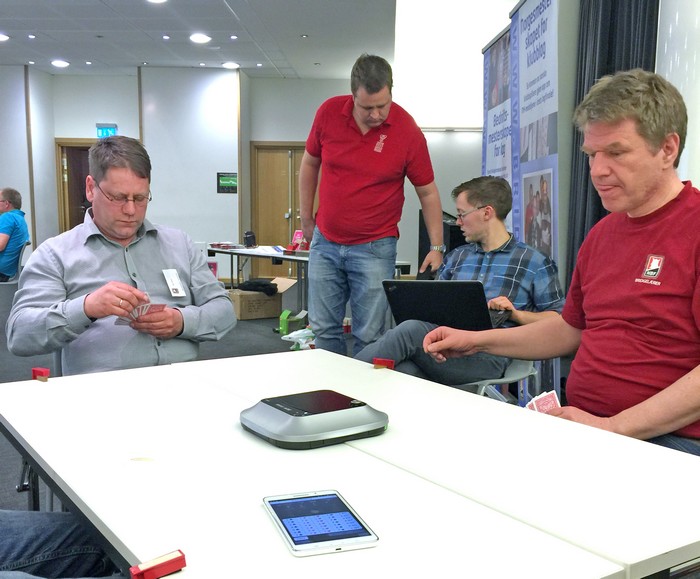 Første turnering med Bridge + more i Norge ble spilt lørdag 11. april under NBFs organisasjonsdager. Her er Ole Årland (t.v) Austevoll BK og Sven-Olai Høyland, Bergen Akademiske BK i aksjon. Allan Livgård (rød t-skjorte) og Kristian Barstad Ellingsen i bakgrunnen.