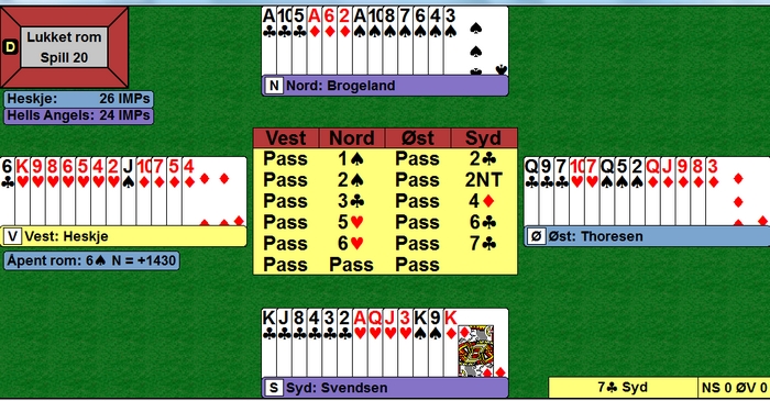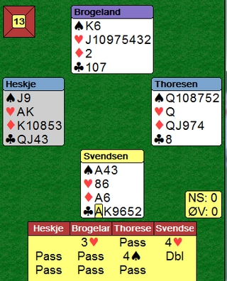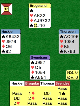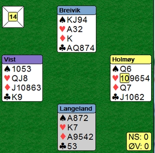Spar til esset og spar til kongen, ingen kapp fordi en kan ikke spille mer enn to runde spar likevel. Ruter kongen, kløver ess og kløver til stjeling. Vest stjeler sikkert over, men syd får enda fint stjålet en kløver og kastet hjertertaperen på ruteresset. Bordet tar de to siste med en trumf og den trettende kløveren.