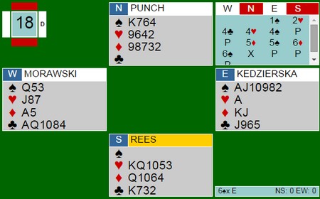 Hjerter ut til esset, ruter knekt til esset og spar dame. Nord kunne holdt spillefører nede på 12 stikk ved ikke å dekke (burde absolutt klart det), men sparkapp og kløverkapp ga alle stikkene. +1310 i dette og +980 i forrige la ikke igjen mange MP til nord syd.