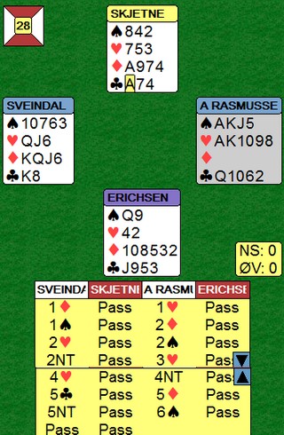 Spar esset og skift til kløver. Hjerter til esset og ruter. Du må stikke med esset og spille mer trumf. Jeg vet ikke om det er rett hver dag hele året, men i alle fall denne gangen når Åsmund Stokkeland kappa på nieren og stjal en ruter hjem. Alt NS fikk var ruter ess og sparesset. Et stor tapsspill siden Mahaffey var i 3kl på det andre bordet.