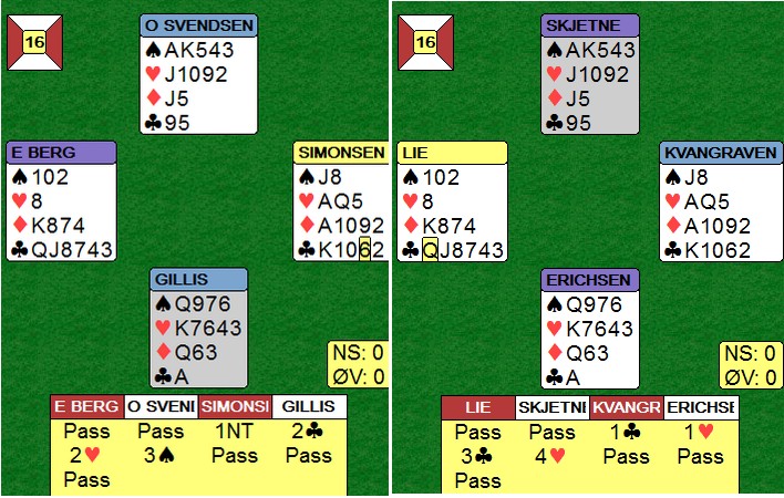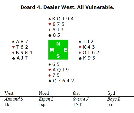 Jeg er aldri noen tilhenger av å melde NT uten hold i motpartens farge, men alternativene var verre for Sverre Johnsen. Spar ut til damen, hjerter til knekten og mer spar til esset. Nå bomma øst ruter med en liten til damen og en ny til nieren. Fire spar stikk, fire hjerterstikk og EKn i ruter ga fire sonebeiter. På den andre hånda kommer sparkongen ut og da er en MYE lengre. Treffer en minorfargene, kan det vinnes åtte stikk.