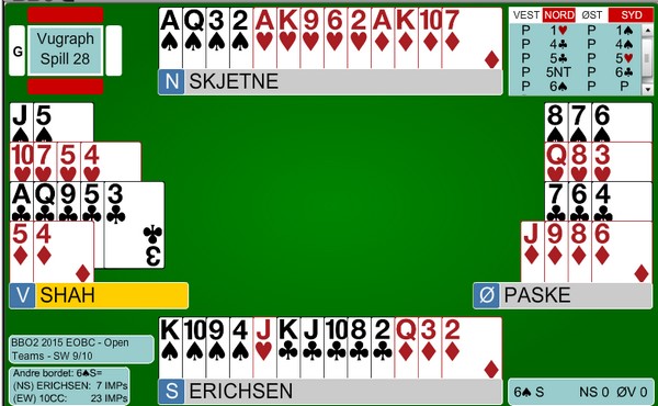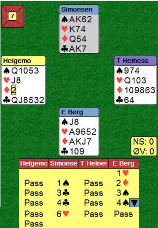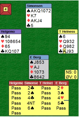 Så en flott storeslem av Berg - Simonsen. 4kl viser renons og EK der var kanskje ikke det beste, men det er jo aldri noen ulempe med esser og konger, så fremt hånda ellers også er sterk. Erik stjal to to små kløverne i bordet og kasta to spar på EK i ruter. 13 stikk.