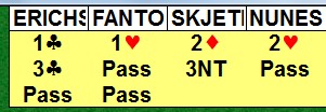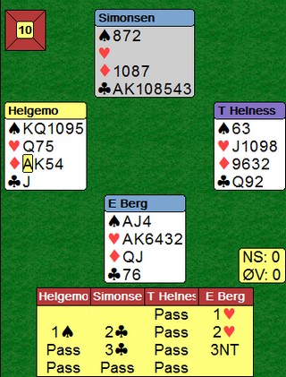 Legg merke til den tynne åpninga til Nils. Kun 10hp, men mottakelig i tre farger. Førstemann på banen. Steffen melder inn på firekortfarge, men omtrent samme argumentet som Nils. "Vi må tidlig inn i meldingsforløpet": Erik Berg er en praktiker og melder det som står, nemlig 3NT.