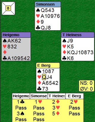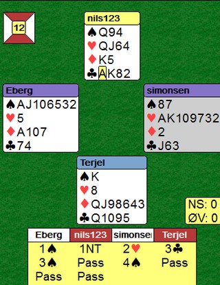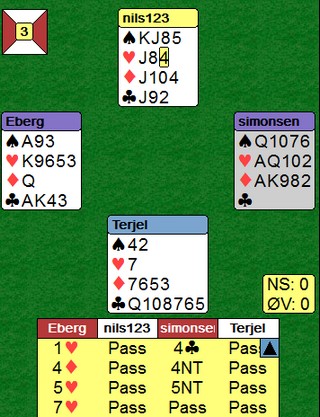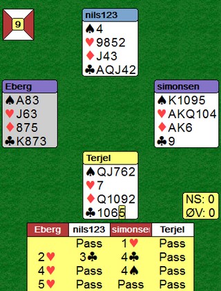 Nils passer over 5kl med EK i en farge og makker har åpnet, uten at jeg helt skjønner hvorfor . Han ble reddet av gong-gongen.