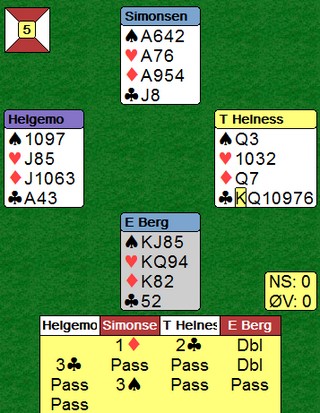 Godt meldt av Berg - Simonsen, men det ble en beit. Jeg vet ikke hva som er beste spilleplan etter EK i kløver ut, men den Erik valgte gikk i alle fall skeis. Han stjal tredje kløveren, ruter ess og ruter til stjeling. Så EK i hjerter og når Terje Lie stjal med sparkongen, ble det beit. Spar til esset etter ruterstjelingen, og så hjerter hadde gitt +620, men det er ikke sikkert det er en bedre plan.