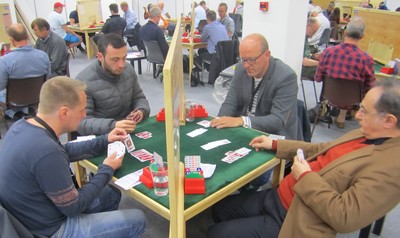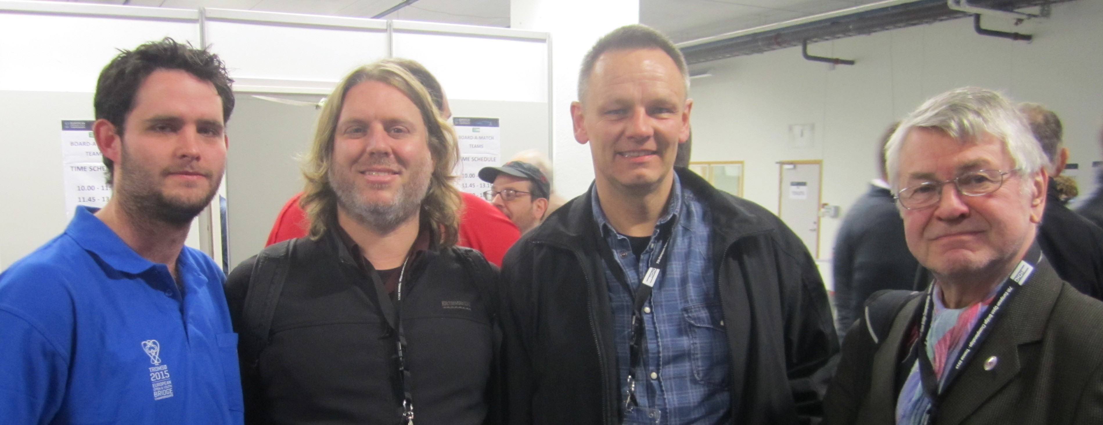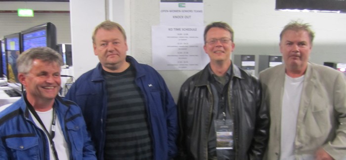 SLUFSA MOT ORANGE WHITE (NEDERLAND) I FINALEN Skrevet 07. juli, 2015 av 7988 Snorre Aalberg | Tagger: EM 2015 Det er fem spill igjen av semifinalen mellom SLUFSA og NORALIA, men kampen er avgjort. Trønderne leder med 57 IMP og det er ikke krutt nok igjen på de siste spillene til å ta inn så mye. I finalen blir det Norge mot Nederland og den starter kl. 10.00 i morgen. Da skal vi sitte pal og heie alt vi kan. Børre Lund - Ole Berset - Olav Arve Høyem og Aksel Hornslien NORALIA avsluttet med stil i det fjerde siste spillet. Først melder Jon og Arild en glimrende 7hj, men den spiller seg ikke selv. Arild vant med kløveresset og tok for bordets DKn i hjerter. Han oppdaget sitsen, men det gikk bra likevel Etter DKn i trumf tok han for KD i spar, tok ruter konge og spilte seg hjem i ruter. På sparesset falt tieren og da var det bare å stjele rutertassen i bordet. +1510. Kieron Dyke, Justin Howard, Arild Rasmussen og Jon Sveindal fikk bronse i EM! Legg til kommentar