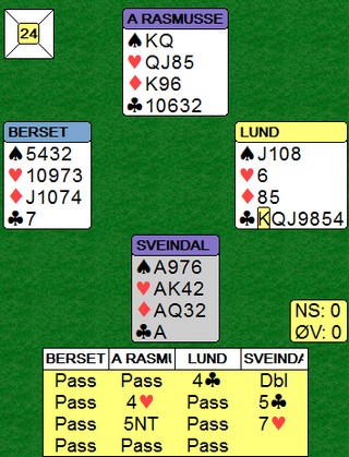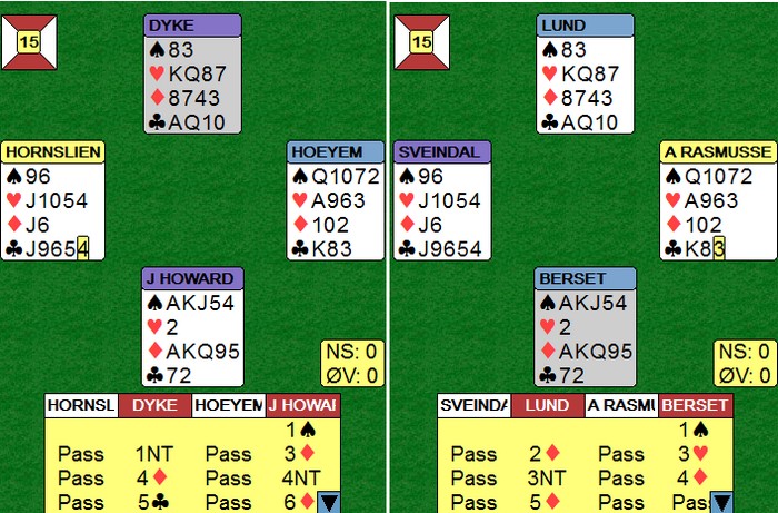 EM lag Semifinale. SLUFSA - NORALIA. 2nd sesjon Skrevet 07. juli, 2015 av 7988 Snorre Aalberg Jeg fikk ikke sett så mange spill i denne sesjonen, men det kommer noen flere spill litt seinere. Slufsa spiller tett og godt, og vant sesjonen 38 -1. Uansett motstand er det sterkt å gi ut bare et eneste IMP på 14 spill. Stillingen halvveis er 71 - 28 til SLUFSA. UTSPILLSKONGEN Jeg har brukt denne overskriften tildligere og nå er det Aksel Hornslien i førersetet. Jeg kjenner mange som ville starta med hjerter fra vest sin hånd mot 6ru, men ikke hr. Hornslien. Kløver fire i disken og god natt. I praksis prøver en vel bordets dame, men selv kløver ess og spar til knekten tror ikke holder fordi det er ikke overganger mellom hendene utenom trumf. Slike spill svinger over 20 IMP når lagkameratene dine er i utgang på det andre bordet. Der hadde NS til og med fått kontrakten på nord sin hånd, men jeg skjønner at Børre hadde dårlig samvittighet etter å ha meldt 2ru over 1sp. Jeg synes 1NT ser mer normalt ut, men jeg skal ikke lære noen å melde i bridge. Ole Berset trodde de enten manglet kløverkontroll (4ru benekter kløverkontroll) eller at det var to esser vekk. _______________________________________________________________________________ Legg til kommentar