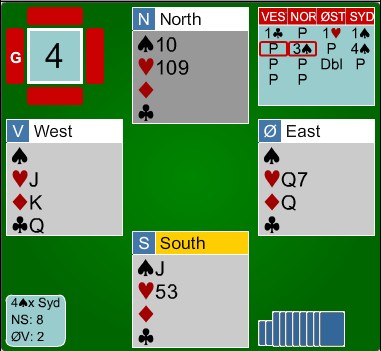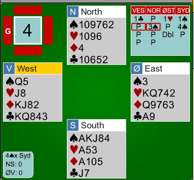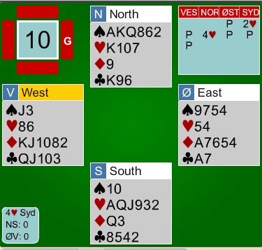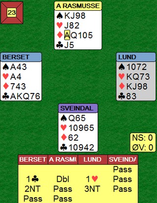 EM lag Semifinale. SLUFSA - NORALIA. 3de sesjon Skrevet 07. juli, 2015 av 7988 Snorre Aalberg Slufsa hadde en ledelse med 71-28 etter to sesjoner, men i den tredje kom Noralia best i gang. NS: Sveindal - Rasmussen ØV: Høyem - Hornslien Jon Sveindal viser igjen god teknikk etter at ØV ikke var helt nøyaktig i innledningen av spillet. Kløver konge i utspill fra Olav Arve Høyem og mer kløver til esset. Nå gjorde Aksel Hornslien det som de fleste av oss ville gjort, nemlig skifta til hjerter konge. Det ble helt galt. Spillefører stakk og eliminerte kløver og ruter samtidig som han tok ut trumfen. Med tre kort igjen er stillingen som under i det Jon frir seg i hjerter. Glimrende spilt!! Vinnende motspill er å ikke røre hjerteren eller skifte til en liten hjerter. Fort gjort å legge ned kongen vel? På det andre bordet stamper ØV i 5ru og går en beit. +790 - 200 = +590 og 11 IMP til Noralia. Etter 10 spill i tredje sesjon er stillingen 26 - 0 til Noralia og sammenlagt 71 - 56 til Slufsa UAVGJORT SPILL Når vi ser alle kortene er det lett. Jeg er likevel imponert over begge bord. Kløverdame i utspill står, mer kløver til esset, liten ruter til kongen og kløver til stjeling. Øst på bordene er Aksel Hornslien og Justin Howard. I spill 10 har Sveindal - Rasmussen en misforståelse der de var uenige om NT-intervallene etter innmelding og havnet i 3kl med 26hp og balanserte hender. Slufsa meldte 3NT og henta 10 IMP. 34 - 11 til Noralia i tredje sesjon. Stillingen med 14 spill igjen er 82-62 til Slufsa Legg til kommentar