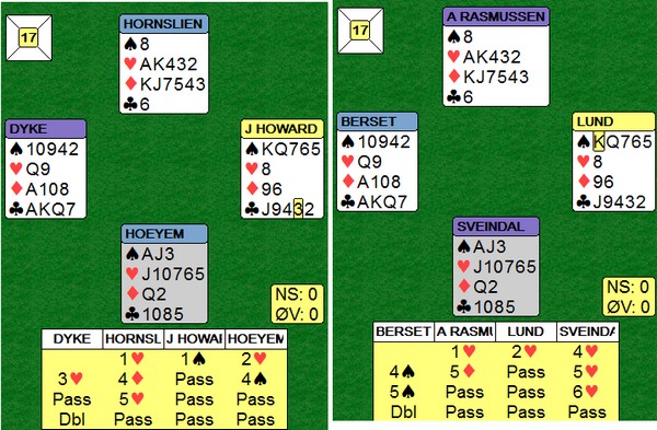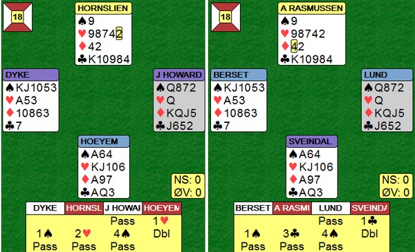 EM lag Semifinale. SLUFSA - NORALIA. 4de sesjon Skrevet 07. juli, 2015 av 7988 Snorre Aalberg | Tagger: EM 2015 Vi går inn i de siste 14 spillene med 20 IMP ledelse til Slufsa. Slufsa øker ledelsen med 19 IMP til på de tre første. Her er det første av dem. Vurderinger på 5-trinnet er alltid vanskelig. Her gjorde Jon Sveindal en uheldig vurdering da han stampet over 5sp og gikk en beit, men det kostet ikke mye. Spillet var allerede tapt når Kieron Dyke doblet 5hj på det andre bordet, en kontrakt som steinsto. Her var nok Hornslien -Høyem heldige, fordi nord mente 4ru for å beskrive hånda si hvis ØV meldte 4sp. Høyem i syd oppfattet det som en sterk melding og gikk på mot slem. +590 FOR UAVGJORT Dette er bare sånt som skjer og en normal endestasjon. * STILLINGEN MED 10 SPILL IGJEN: 101 - 62 til Slufsa SPIKEREN I KISTA!! Begge bord er i 3NT, men i lukket spillet Aksel Hornslien ut spar. Spillefører dukker to ganger og tester kløveren. Nå går det an å vinne enda ved å spille nord for ED i ruter, men en bedre plan er nok å satse på at syd har ruteresset og bare tre spar. Derfor godspiller Kieron Dyke kløveren, men nord kommer inn i ruter og tar beita med den trettende sparen. Arild Rasmussen starter med ruter ess (!) og når han fortsetter med ruter (litt rart når han ser KKn9 i bordet) blir det lett hjemgang. Etter rutereresset er det geschloss uansett FIRE SPILL IGJEN OG 120 - 63 til SLUFSA. Nå er eneste sjanse for seier til Noralia at Lasarus står opp enda en gang. Det gjør han neppe og jeg gratulerer alledere nå SLUFSA med finaleplas. Dette var rett og slett impnerende god bridge, trøndergutter.. Legg til kommentar