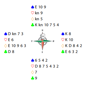 For at hjerter ut skal være noe særlig bra må nesten nord har kongen eller esset tredje og et inntak i en annen farge. Det er ikke så sannsynlig etter dette meldingsforløpet. Nord hadde sjansen å redoble 2 hjerter også, så Bogen slo fra seg hjerterutspill. Kan det være riktig å spille ut kløver, fargen makker "meldte"? Jeg sier "meldte" i anførselstegn fordi Flakstads 1 kløver ikke viste farge. Selv har jeg en meget sterk aversjon mot å spille ut singelton i grand i en umeldt farge for å "treffe" makker da det skal så mye til før det før det blir riktig. Mye oftere enn det blir blink ruller man opp makkers lengde i en farge motparten har 4-3 eller 4-4. Vel, Bogen vet nok det, men han spilte ut kløver 9 likevel. Og for en blink det var: