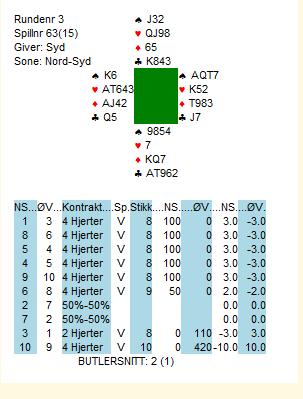 I 2. runde av helgens batalje satt Petter (N) og Tommy (S) mot Vestnesingene Torbjørn Amdam (V) og Gunnar Ødegård (Ø). Tommy i syd åpnet i 1 spar til pass og 3 kl hos makker som viser 7-9 hfp og 4+ spar. Gunnar Ødegård i Øst valgte nå å doble denne meldingen. Det er kanskje bedre å melde inn 4 kløver direkte på disse kortene, men er avtalene på plass går det vel å doble også....